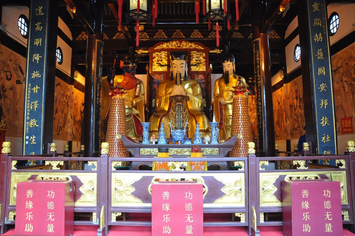 三官殿中供奉的是主管天上事务、地上事务和水中事务的神灵,号天官、地官和水官,合称三官。因为他们的诞辰分别为上元、中元、下元节,所以称他们为三元三官大帝。