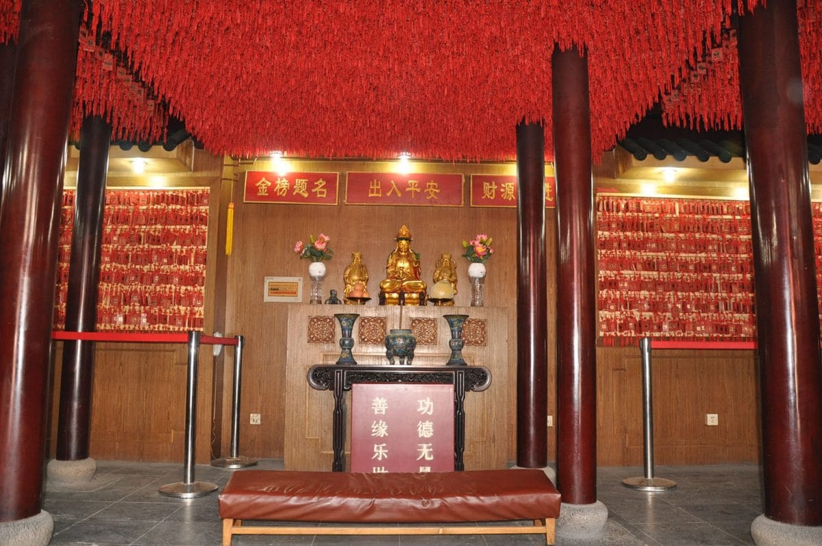 The building on your right is the Chapel of Wishes. Coming into the Chapel, you’ll see roof and walls covered by little red plates, on which people wrote their names and wishes. At the front of the Chapel of Wishes, there are three plaques, one dealing with wealth, one with peace and the other, one with academic achievement.