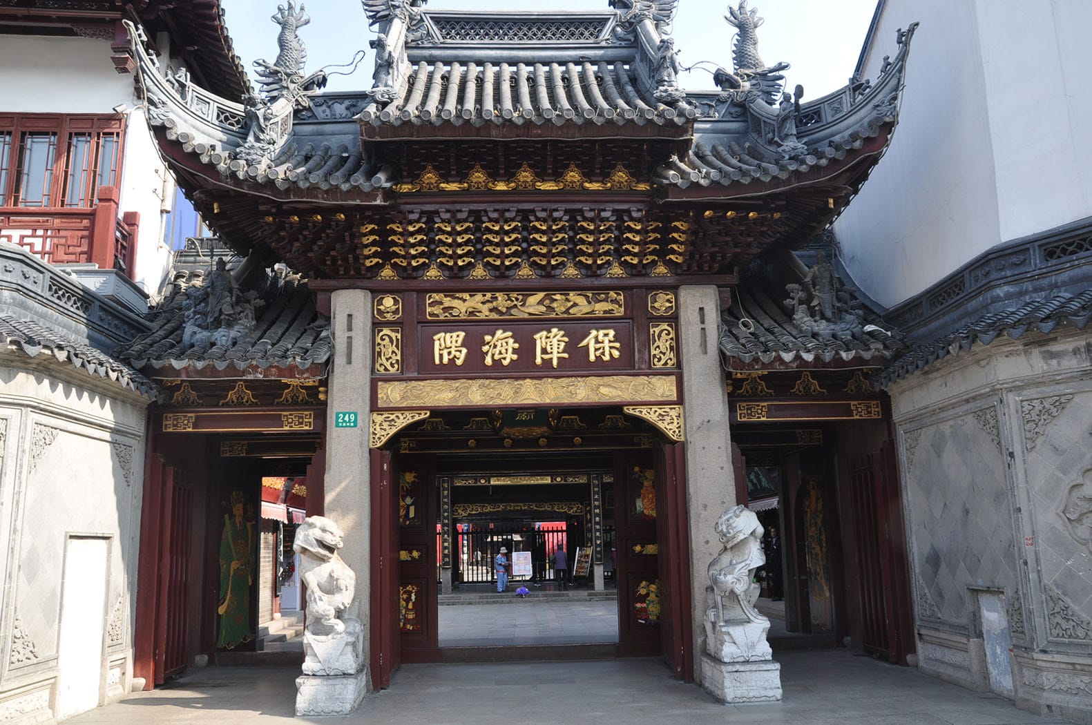 - Now, you are at the front gate of the Shanghai City God Temple. The front gate of temple is often called “Mountain Gate”, as the early Taoist hermits built their chapels in the mountain in order to live a life of tranquility and taciturnity. City God Temple’s mountain gate was built in 1535, the 14th year of Emperor Jia-jing’s reign during Ming Dynasty, thus today it enjoys a history of more than 450 years. The structure of mountain gate consists of stone pillars and timber beams. The four golden characters up the gate read “to protect the coastline”, which actually means to protect Shanghai. The characters were originally written by Shanghai county sheriff Fengbin in the Ming Dynasty; however, what you see today is a reproduction based on historical pictures, created in 1994 from which time the City God Temple has once again been open to the public. The two stone lions in front of the mountain gate also have a history of hundreds of years. People believe that patting their heads will bring peace and luck. After being touched by thousands and thousands of visitors, you can see their bodies are very shiny now.